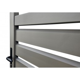 Portillon aluminium gris avec lames biseautées en partie supérieure, vantail de 1m (largeur entre piliers: 1.04m). HAUTEUR: 1.56m (hauteur minimum des piliers: 1.70m sous chapeau) Gris RAL 7024 ou blanc RAL 9010 Quincaillerie fournie. La serrure permet l'utilisation d'une gâche électrique. Sélectionner ci dessous la couleur, le sens d'ouverture, la...